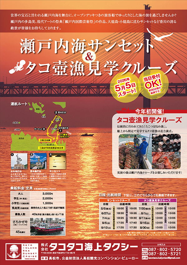2026年04月30日 | お知らせ 瀬戸内海サンセットクルーズ&タコ壺漁見学クルーズが開催されます 瀬戸内海の多島美を楽しんでいただくため、5月から9月までの間「瀬戸内海サンセットクルーズ」と「タコ壺漁見学クルーズ」の2コースの内容で計10回開催されます。「瀬戸内海サンセットクルーズ」ではサンポートを出発後、女木島・男… 続きを読む・・・