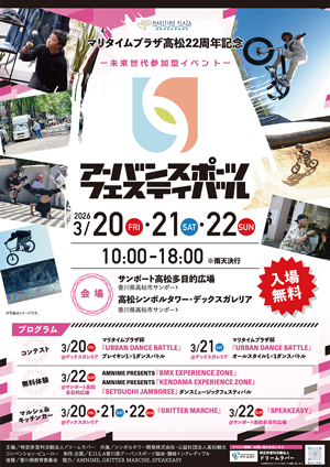 | 内容 | マリタイムプラザ高松22周年を記念し、香川県でアーバンスポーツを普及させ、青少年育成やサンポートエリアの更なる活性化を目的として開催します。詳しくはこちらから。 |