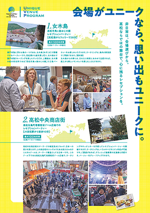 新たにコンベンションの会場として利用可能なあなぶきアリーナを初め、サンポート周辺の施設と高松市の地域の魅力を活かした新たなユニークベニューとして女木島と高松丸亀町商店街壱番街ドーム前広場を紹介しております。(日・英あり)