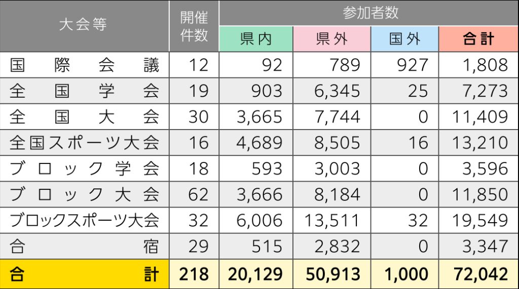 令和6年度、香川県内で開催された四国規模以上のコンベンション(スポーツ含む)は、218件、参加者数は72,042名(内県外参加者51,913名)でした。
